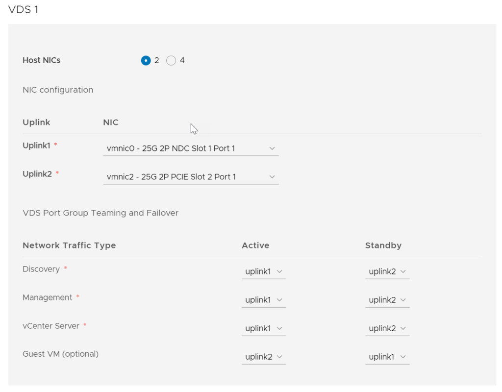 Next, we can define the number of Uplinks assigned to the vDS (2 or 4). Once defined we assign a physical NIC per uplink. In this example, I have selected a physical NIC from the NDC and a physical NIC from the PCI-E card thus giving us physical NIC redundancy. We also define active and standby uplinks for each of the traffic types. Also it worth noting post-build-up we can change to an active/active configuration.